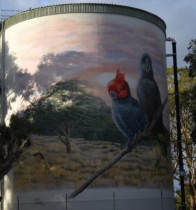 Turn up South Street to the historic Murrumbateman Bush Cemetery to see a magnificent artwork on the water reservoir – featuring Gang Gangs, Golden Sun Moth, rare flora and fauna found in the critically endangered box gum grassy woodland of the Cemetery.